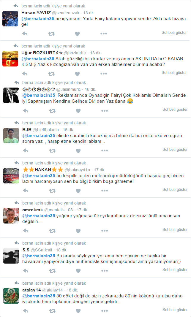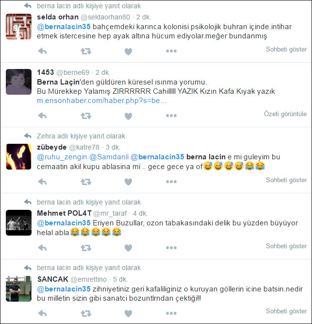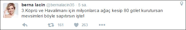 Laçin'in "3.Köprü ve Havalimanı için milyonlarca ağaç kesip 80 gölet kurutursan mevsimleri böyle sapıtırsın işte! 3.köprü ve havalimanı inşaatında çalışan yabancı mühendisler 'Kendinizi öldürüyorsunuz her yerde ağaçlar korunarak yapıyoruz' diyorlar!" şeklinde attığı tweetlere birbirinde komik cevaplar geldi.
