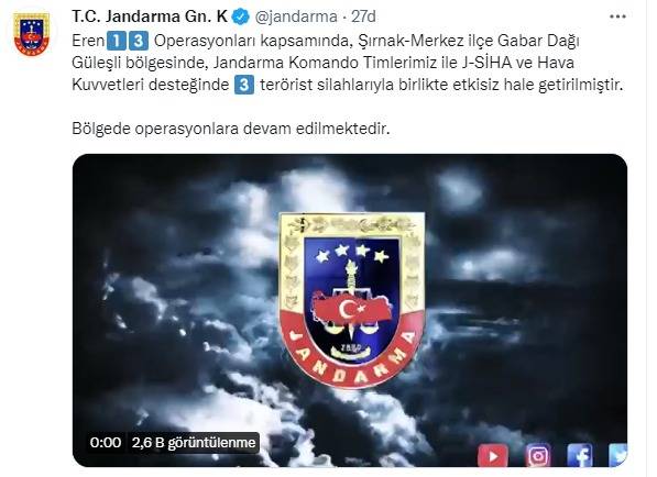Jandarma Genel Komutanlığı tarafından yapılan paylaşımda, "Eren-13 Operasyonları kapsamında, Şırnak-Merkez ilçe Gabar Dağı Güleşli bölgesinde, Jandarma Komando Timlerimiz ile J-SİHA ve Hava Kuvvetleri desteğinde 3 terörist silahlarıyla birlikte etkisiz hale getirilmiştir. Bölgede operasyonlara devam edilmektedir” ifadelerine yer verildi.