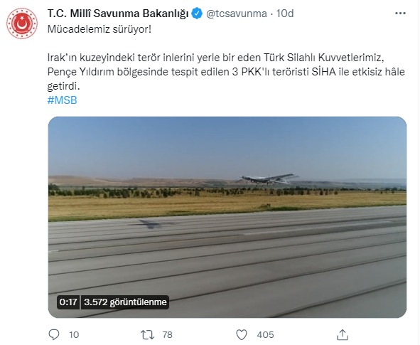 MSB tarafından yapılan paylaşımda, “Mücadelemiz sürüyor! Irak’ın kuzeyindeki terör inlerini yerle bir eden Türk Silahlı Kuvvetlerimiz, Pençe Yıldırım bölgesinde tespit edilen 3 PKK'lı teröristi SİHA ile etkisiz hâle getirdi” ifadeleri kullanıldı.