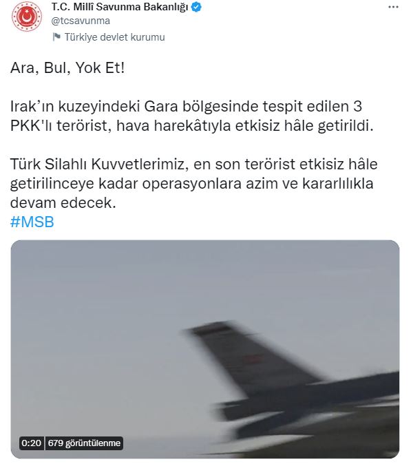 “Ara, Bul, Yok Et!” ifadeleri ile yapılan paylaşımda, “Irak’ın kuzeyindeki Gara bölgesinde tespit edilen 3 PKK'lı terörist, hava harekâtıyla etkisiz hâle getirildi. Türk Silahlı Kuvvetlerimiz, en son terörist etkisiz hâle getirilinceye kadar operasyonlara azim ve kararlılıkla devam edecek” denildi.
