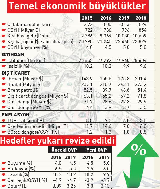 Türkiye'yi yüksek gelir grubuna çıkaracak hedefleri belirleyen ekonomi yönetimi, 2016-2018 yol haritasında 'büyüme, yatırım ve istihdama' odaklandı. Bu yıl 450 milyar liralık yatırım yapılacak. 3 yılda 2 milyon kişiye iş kapısı açılacak