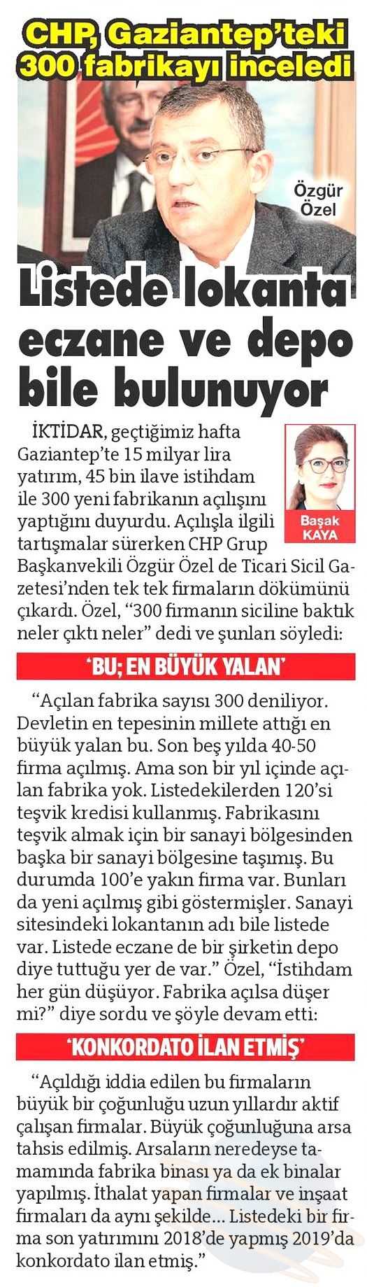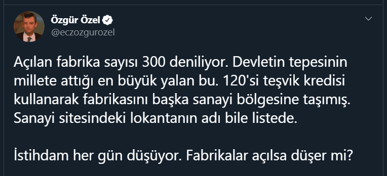 CHP’li Özgür Özel, konuya dair bir de sosyal medya hesabından paylaşım yaptı. CHP’li müfteri, “Açılan fabrika sayısı 300 deniliyor. Devletin tepesinin millete attığı en büyük yalan bu. 120'si teşvik kredisi kullanarak fabrikasını başka sanayi bölgesine taşımış. Sanayi sitesindeki lokantanın adı bile listede. İstihdam her gün düşüyor. Fabrikalar açılsa düşer mi?” ifadelerini kullandı.