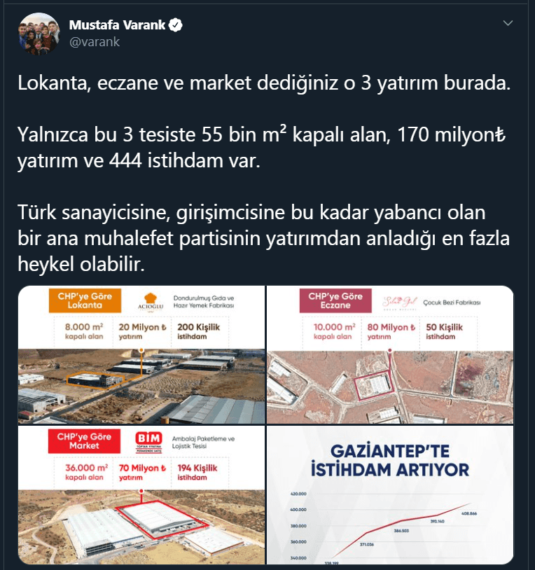 Sanayi ve Teknoloji Bakanı Mustafa Varank, açılan fabrikalara örnek vererek Özel’e göndermelerde bulundu. “Lokanta, eczane ve market dediğiniz o 3 yatırım burada. Yalnızca bu 3 tesiste 55 bin m² kapalı alan, 170 milyon₺ yatırım ve 444 istihdam var” bilgisini veren ve fabrikaların görüntülerini paylaşıp önemli verileri açıklayan Varank, “Türk sanayicisine, girişimcisine bu kadar yabancı olan bir ana muhalefet partisinin yatırımdan anladığı en fazla heykel olabilir” diye yazdı.