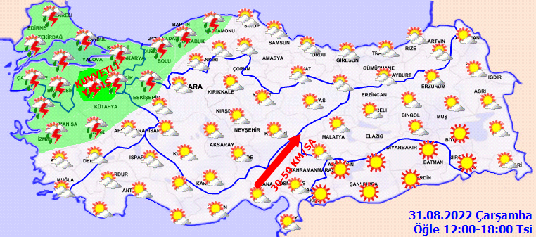 Meteoroloji Genel Müdürlüğü tarafından yapılan son değerlendirmelere göre: Ülkemizin kuzey ve batı kesimlerinin parçalı ve yer yer çok bulutlu, Marmara, Batı Karadeniz (Sinop hariç) ile İzmir, Manisa, Uşak, Kütahya ve Eskişehir çevrelerinin yerel olmak üzere sağanak ve gök gürültülü sağanak yağışlı, diğer yerlerin az bulutlu ve açık geçeceği tahmin ediliyor. Yağışların; Marmara’nın doğusu ve Tekirdağ çevreleri ile Kırklareli’nin kıyı, Çanakkale’nin doğu kesimlerinde yerel olarak kuvvetli olması bekleniyor.