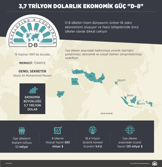 Türkiye'nin ev sahipliğinde bir araya gelen D-8 ülkeleri, İslam dünyasının bölgelerinde öncü ülkeleri olarak dikkati çekiyor. Türkiye ve Endonezya, dünyanın en büyük ekonomilerinin yer aldığı G20'de de bulunuyor.