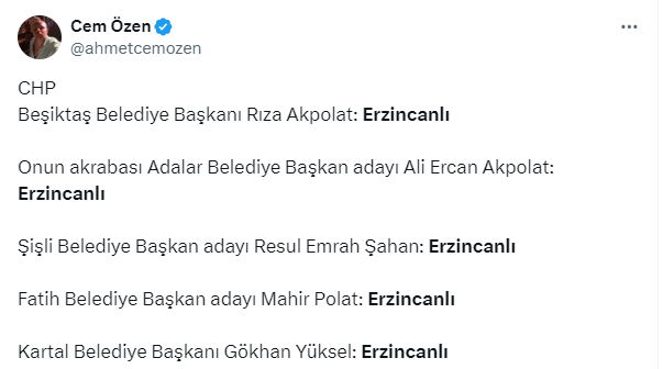 Ekrem İmamoğlu öncülüğünde hazırlanan listedeki 5 ilçenin başkan adayının birden, Erzincanlı olması dikkat çekiyor.