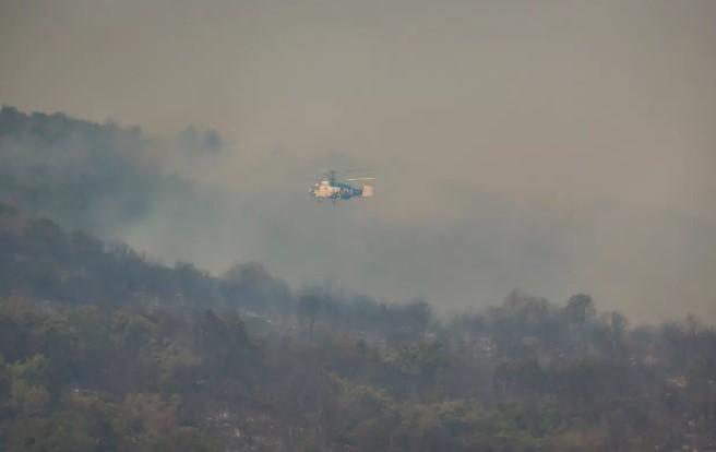 Ekipler, rüzgarın da etkisiyle yayılan alevleri kontrol altına almak için arazözlerle karadan, yangın söndürme helikopteriyle de havadan müdahale ediyor.