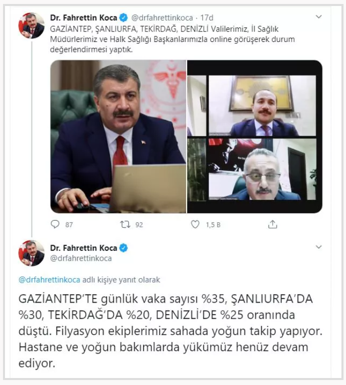 Bakan Koca paylaşımının devamında olumlu sonuçlar için yerel ilave tedbirlerin hızlı ve kararlı uygulanmasının önemini vurguladı.
