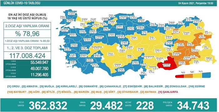 18 yaş üstünde en az iki doz aşı yaptıranların oranının en yüksek olduğu 10 il Ordu, Amasya, Muğla, Kırklareli, Osmaniye, Çanakkale, Eskişehir, Balıkesir, Zonguldak ve Edirne oldu.