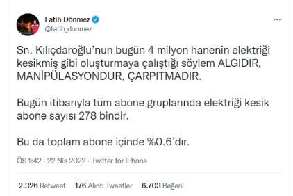 Enerji ve Tabii Kaynaklar Bakanı Fatih Dönmez, Kılıçdaroğlu'nun iddiasını Twitter hesabından yalanladı.