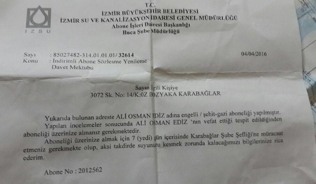 İzmirli Ali Osman Ediz, 4 Nisan 2016’da evine gelen mektupla şoke oldu. İzmir Büyükşehir Belediyesi Su ve Kanalizasyon İdaresi Genel Müdürlüğü (İZSU)'nun Ediz’e gönderdiği mektupta, 56 yaşındaki adamın vefat edildiğinin tespit edildiği ve aboneliğin başkası üzerine alınması gerektiği yazıyordu. Ali Osman Ediz adına engelli/şehit-gazi aboneliği yapıldığı ifade edilen İZSU Genel Müdür Yardımcısı S.B. imzalı mektupta, “Yapılan incelemeler sonucunda Ali Osman Ediz’in vefat ettiği tespit edildiğinden aboneliği üzerinize almanız gerekmektedir. Aboneliği üzerinize almak için 7 gün içerisinde Karabağlar Şube Şefliğine müracaat etmeniz gerekmekte olup, aksi takdirde suyunuzu kesmek zorunda kalacağımızı bilgilerinize rica ederim” denildi. Mektubu okuyunca kısa süreli şok yaşayan Ediz, soluğu İZSU’da aldı.