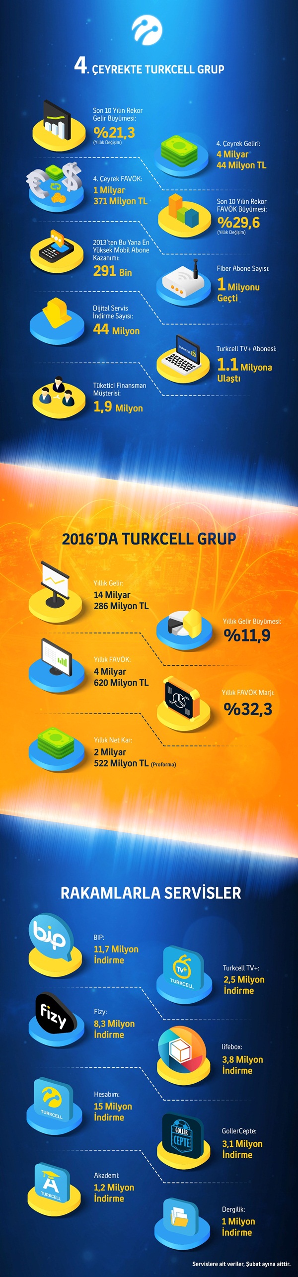 Turkcell Grubu yılın son çeyreğinde yüzde 21,3 büyüme ile 4 milyar TL ciroya ulaşırken, yüzde 29,6 artışla 1,4 milyar TL FAVÖK elde etti. 2016 yılının son çeyreğinde hem gelir hem de FAVÖK’te, son 10 yılın en yüksek büyüme oranını yakaladı.