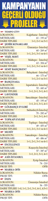 Bir kısmı Emlak Konut GYO ile geliştirilen projeleri de kapsayan kampanyanın en avantajlı yönlerinden birisi de banka kredisi seçeneğinin olmaması. Bu nedenle vatandaşlar yıllık yüzde 20’leri geçen banka faizi yükünden de kurtulmuş olacak. Kampanyaya dahil edilen Marka ve Exen projeleri ile Axis İstanbul’da hazır ofis ve daireleri satın alanlar taksitlerinin bir kısmını elde edecekleri kiradan ödeyebilecekler.
