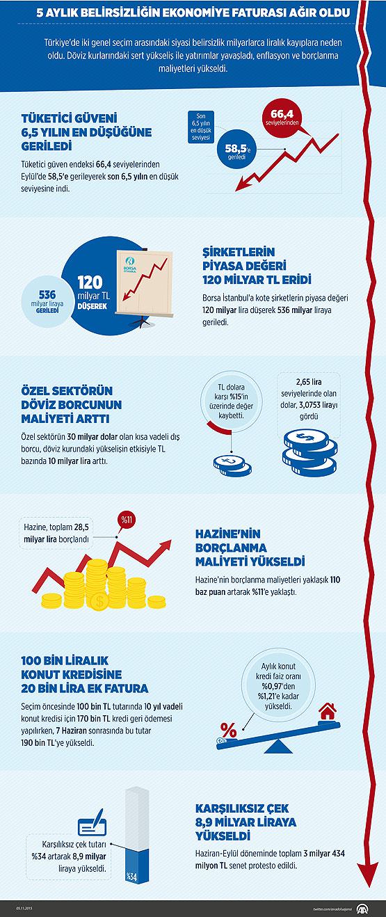 Yılın ilk aylarında pozitif bir seyir izleyen yurt içi piyasalar, 7 Haziran'daki genel seçim öncesinde yayımlanan anketlerde yaklaşık 13 yıldır süren tek parti iktidarına ara verilebileceğine işaret etmesi ile negatife dönerek, finansal alan ile vatandaşların tasarruflarında, ekonomik göstergeler ile de genel bütçede yara açtı. 7 Haziran seçimi öncesindeki anketlerle tek parti hükümeti kurulamayacağı beklentilerinin arttığı günlerden 1 Kasım seçimine kadar geçen süreçte, ülkenin büyüme hızı iç talep azalmasıyla yavaşlarken, döviz kurlarındaki sert yükseliş ile yatırımlar azaldı, enflasyon ve borçlanma maliyetleri yükseldi.