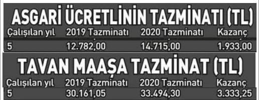 Asgari ücrete yapılan yüzde 15 zam, çalışanların kıdem tazminatını da artıracak. En düşük rakam 2.943 liraya, tavan fiyat ise 6.699 liraya çıkacak. Kıdem tazminatı, çalışılan yılla son brüt ücretin çarpılması sonucu bulunduğu için 2020'deki tazminatlar yeni ücret üzerinden hesaplanacak. 5 yıldır çalışan bir asgari ücretli işçinin kıdem tazminatı 2019'da 30.161,05 lira olurken, bu rakam 2020'de 33.494,30 liraya çıkacak. Böylece çalışan 3 bin 333,25 lira daha fazla para almış olacak.