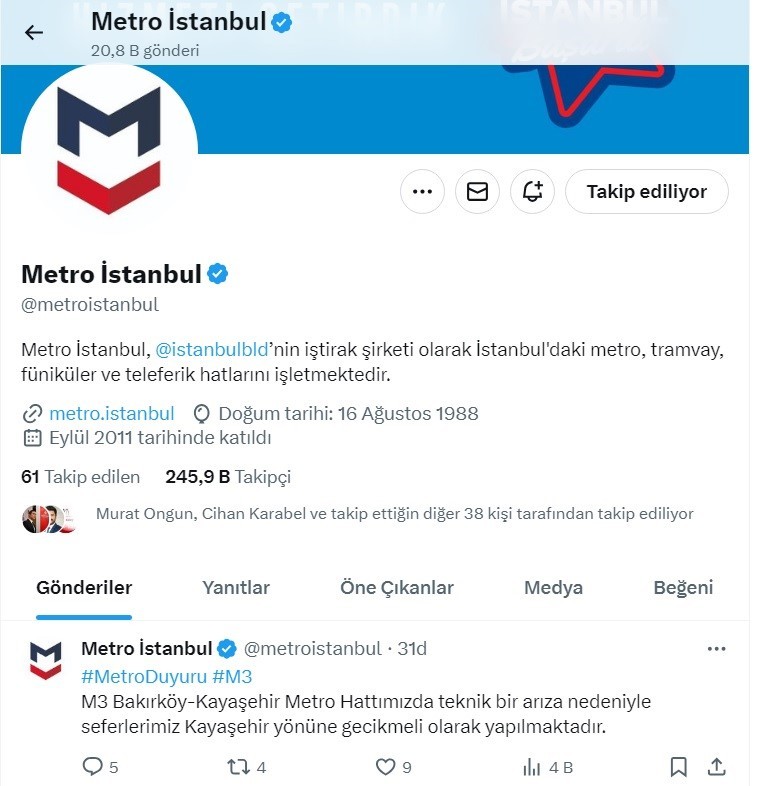 Metro İstanbul'un sosyal medya hesabından yapılan açıklamada, "M3 Bakırköy-Kayaşehir metro hattımızda teknik bir arıza nedeniyle seferlerimiz Kayaşehir yönünde gecikmeli olarak yapılmaktadır" denildi.