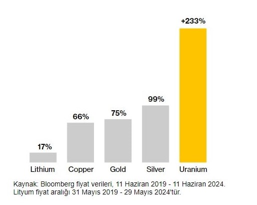 Nükleer enerjiye dönüş ise uranyum fiyatlarını tırmandırdı. Uranyum fiyatları son 5 yılda yüzde 233 yükseldi. Böylece uranyumun kazancı altın ve bakırın kazançlarının üç katını aştı.