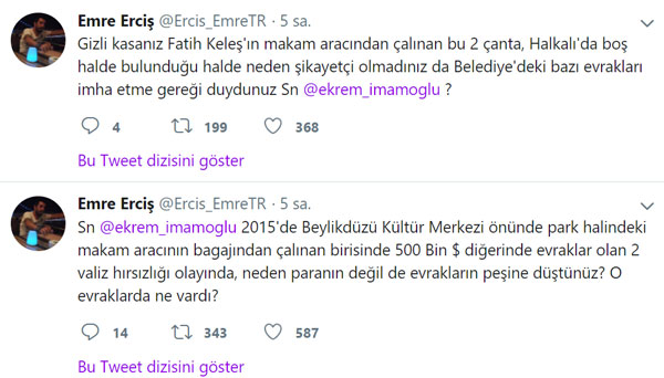Twitter hesabından paylaşımlarda bulunan Erciş; birinde 500 bin dolar, diğerinde çeşitli evraklar bulunan valizler çalındıktan sonra, dönemin Beylikdüzü Belediye Başkanı Ekrem İmamoğlu’nun niçin paranın değil de evrakların peşinde düştüğünü sordu.