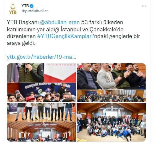 Kültür ve Turizm Bakanlığı Yurtdışı Türkler ve Akraba Topluluklar Başkanlığı (YTB) her yıl yurt dışındaki Türk vatandaşlarına yönelik YTB Gençlik Kampları düzenliyor. Bu yıl gençlik kampları, 19 Mayıs haftasında yurt dışındaki Türk vatandaşlarının yanı sıra Türkiye’deki uluslararası öğrenciler ve soydaş coğrafyalardan da gençlerin katılımıyla gerçekleştirildi. Çanakkale ve İstanbul’da kız ve erkek katılımcılar için organize edilen kamp programlarında 53 ülkeden 233 genç yer aldı.