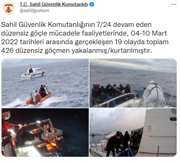 Düzensiz göç ile mücadele devam ederken Sahil Güvenlik Komutanlığı dikkat çeken bir paylaşımda bulundu. Sahil Güvenlik Komutanlığı resmi sosyal medya hesabı üzerinden yapılan paylaşımda, “Sahil Güvenlik Komutanlığının 7/24 devam eden düzensiz göçle mücadele faaliyetlerinde, 04-10 Mart 2022 tarihleri arasında gerçekleşen 19 olayda toplam 426 düzensiz göçmen yakalanmış/kurtarılmıştır” ifadeleri kullanıldı.
