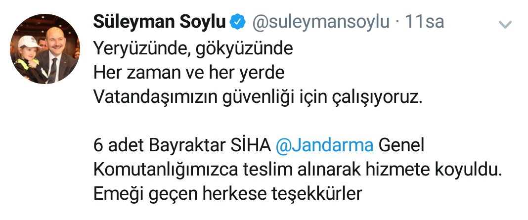 İçişleri Bakanı Süleyman Soylu, Twitter hesabından yaptığı paylaşımda, “Gökyüzünde her zaman ve her yerde vatandaşımızın güvenliği için çalışıyoruz” dedi. Soylu açıklamasının devamında, “6 Silahlı İnsansız Hava Aracı, Jandarma Genel Komutanlığımızca teslim alınarak hizmete koyuldu. Emeği geçen herkese teşekkürler” ifadelerini kullandı.
