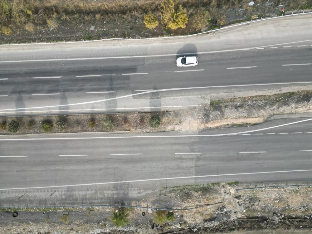 Güzergahtaki bir araç sol şeritten seyrederken fay hattının geçtiği noktada bir anda orta şeritte kalıp yoluna devam etmek zorunda kalıyor. Depremin izlerini taşıyan yolun son durumu dron ile de görüntülendi.