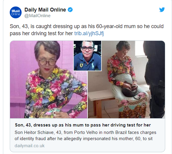 Brezilya'da, 3 kez ehliyet sınavını geçemeyen 60 yaşındaki annesinin kılığına giren 43 yaşındaki bir adam direksiyon sınavında yakayı ele verdi.