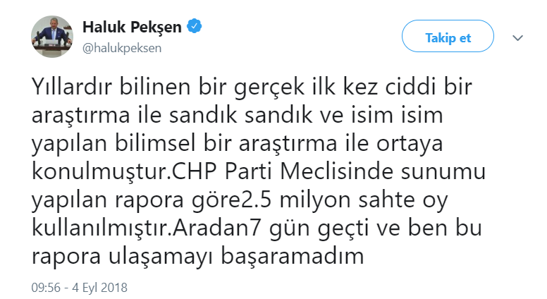 "CHP Parti Meclisi'nde sunumu yapılan rapora göre 2.5 milyon sahte oy kullanılmıştır. Aradan 7 gün geçti ve ben bu rapora ulaşamayı başaramadım" dedi.
