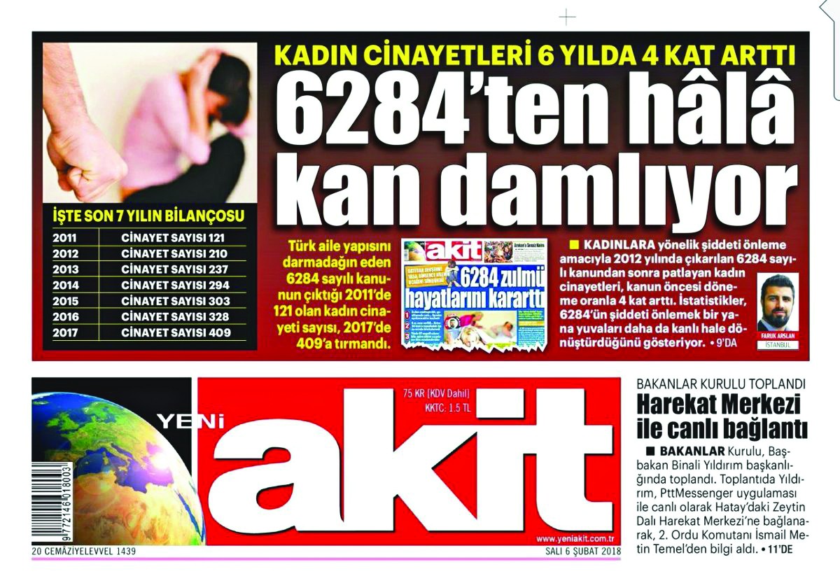 -Akit, 6284 sayılı kanunun kadın cinayetlerini önlemek bir yana daha da artırdığını rakamlarla gündeme getirmişti.