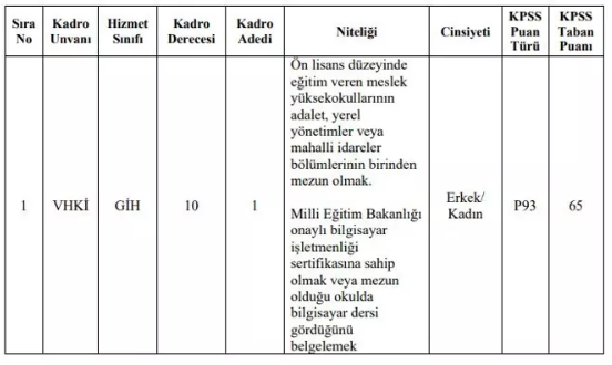 Söz konusu en az 65 KPSS puanı ile memur alımı ilanı hakkındaki diğer detaylar aşağıda yer alıyor.