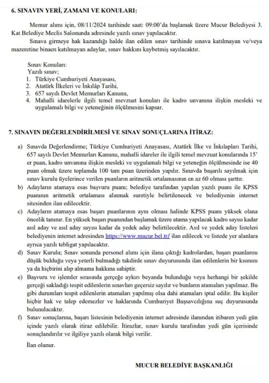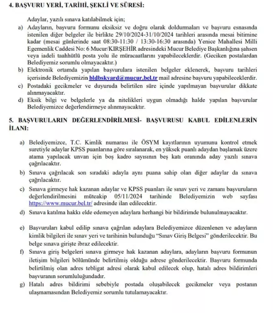 Kırşehir ili Mucur Belediye Başkanlığı tarafından duyurulan memur alımı ilanına başvuru yapacak adayların, yazılı sınava katılabilmeleri için başvuru formunu eksiksiz ve doğru olarak doldurmaları gerekmekte.