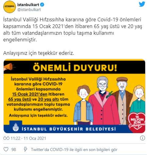 İstanbul'da koronavirüs önlemleri kapsamında 15 Ocak 2021'den itibaren 65 yaş üstü ve 20 yaş altına toplu taşıma araçlarına binemeyecek. İstanbulkart'ın sosyal medya hesabından yapılan paylaşımda "İstanbul Valiliği Hıfzıssıhha kararına göre Covid-19 önlemleri kapsamında 15 Ocak 2021'den itibaren 65 yaş üstü ve 20 yaş altı tüm vatandaşlarımızın toplu taşıma kullanımı engellenmiştir" ifadeleri kullanıldı.