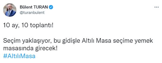 AK Parti Grup Başkanvekili Bülent Turan, 6'lı masanın 10. toplantısının ardından yayınladıkları ortak bildiride cumhurbaşkanı adayını belirlemek için istişare kararı aldıklarını açıklamasını tiye alarak, "Bu gidişle Altılı Masa seçime yemek masasında girecek!" dedi.