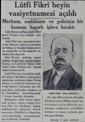 7 Ekim 1934: İstanbul Barosu Reisi Lütfi Fikri Bey’in Vefatı