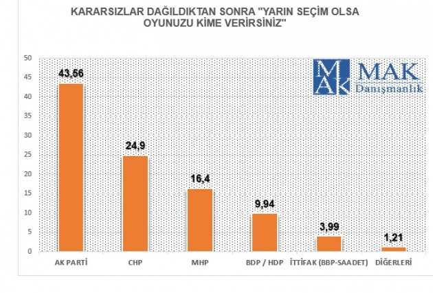 MAK Danışmanlık 18-26 Mayıs 2015 tarihinde 30 büyükşehir, 17 il, 183 ilçede 8.100 kişi ile yüzyüze görüşerek yaptığı seçim öncesi son kamuoyu araştırmasının sonuçlarını açıkladı. MAK Danışmanlık ayrıca, Avrupa’nın 5 ülkesinde de 2155 kişi ile görüşerek bir anket çalışması yaptı.