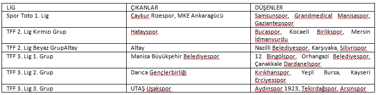 Spor Toto 1. Lig, TFF 2. Lig ve TFF 3. Lig'de toplam 18 takım ise bir alt lige düştü.