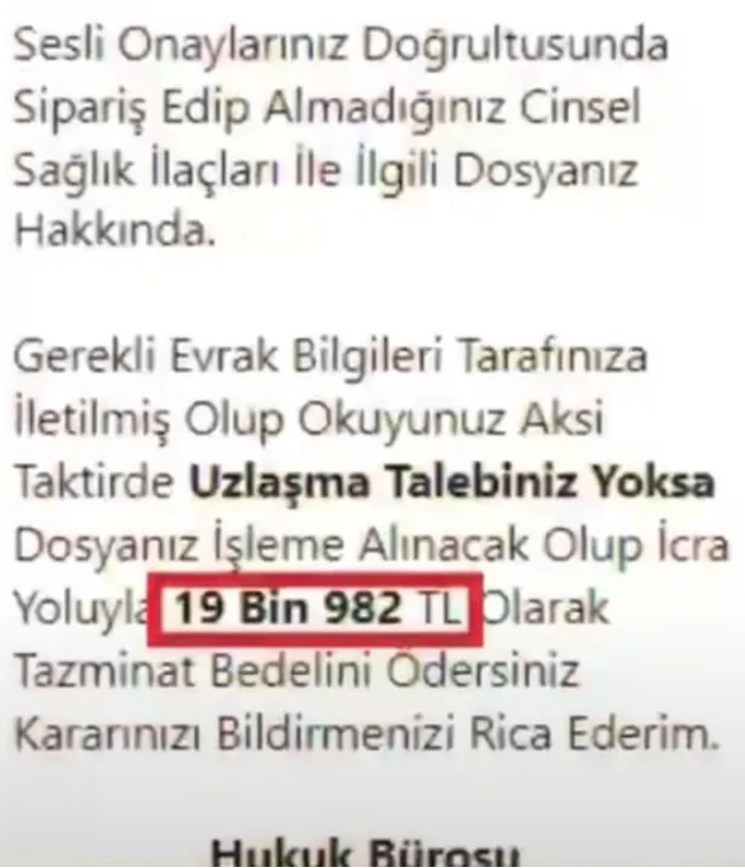 Taşdöğen söz konusu tebligatta yer alan ifadelerin “Sipariş edip almadığınız cinsel sağlık ilaçları ile ilgili dosyanız hakkında dosyanız işleme alınacak olup icra yoluyla 19 bin 982 TL olarak tazminat bedelini ödersiniz” olduğunu anlattı.