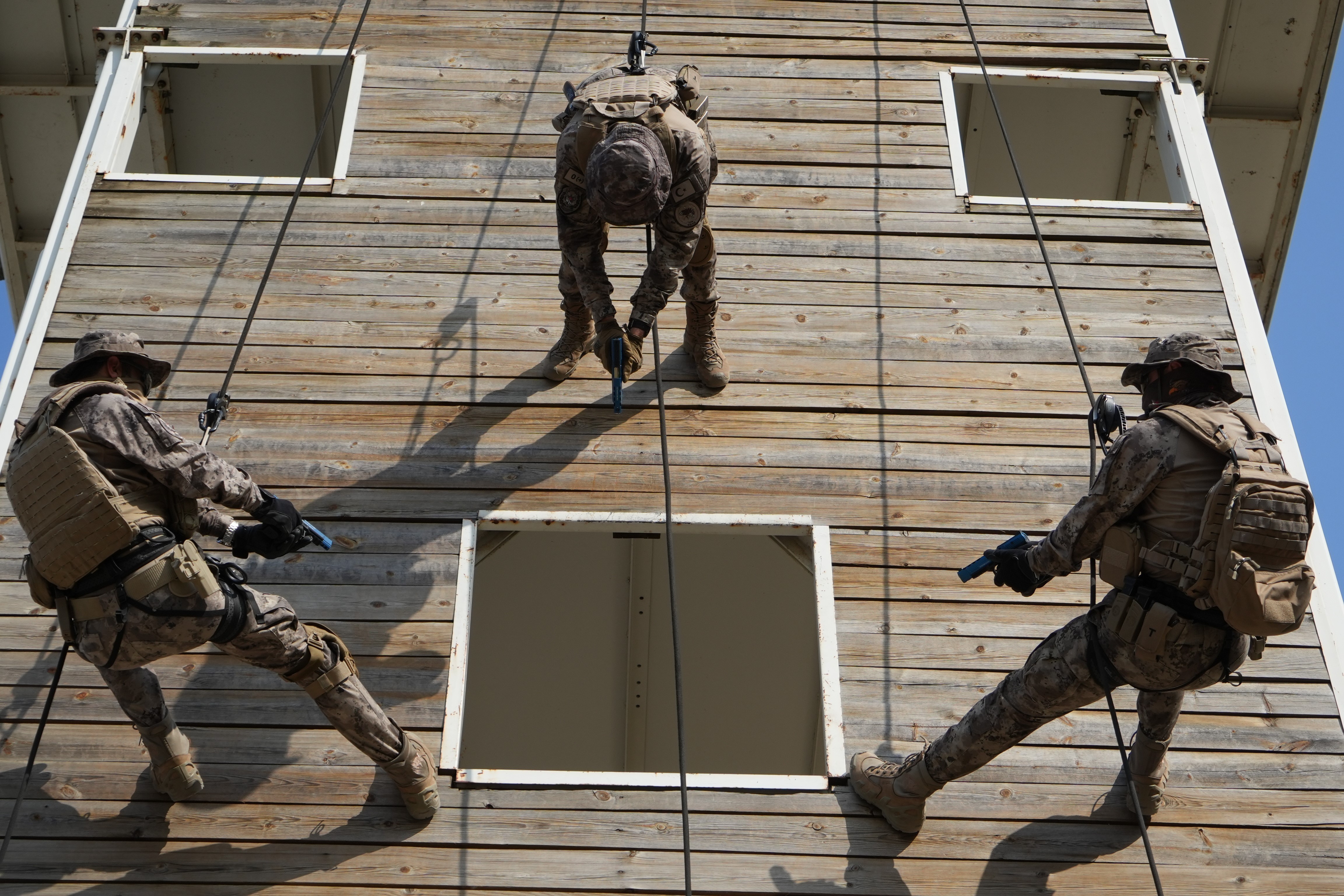 Özel Harekatçılar dağcılık kulesinden de uyumlu bir şekilde yüzüstü yarasa inişi ile yere indiler.
