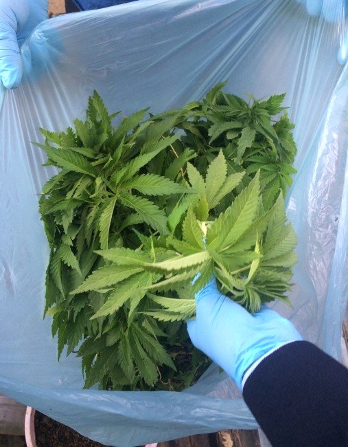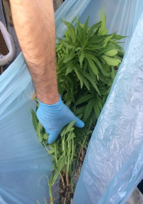 Eve baskın yapan polis yaptığı aramada çatı katındaki saksı ve tenekeler içerisinde yetiştirilen 480 kök Hint keneviri buldu. Evdeki aramalarını sürdüren polis, içime ve satışa hazır halde 80 gram da esrar buldu.
