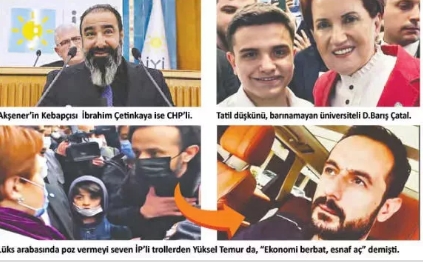- Konya’da Akşener’in karşısında sözde dertli esnafı oynayan Yüksel Temur, “Ekonomi berbat. Yeter bıktık. Bakın şimdi bana FETÖ’cü, PKK, DHKP-C diyecekler, her şeyi diyecekler” ifadesini kullandı. Pahalı araçlarla fotoğrafları çıkan Temur’un lüks restoran sahibi olduğu ve şatafat içinde yaşadığı ortaya çıktı.