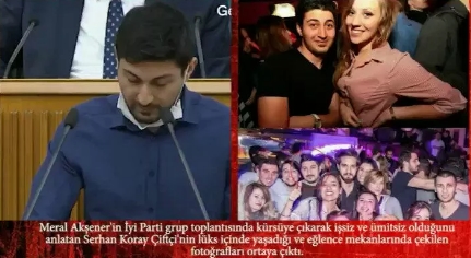 - Aynı mizanseni Haziran 2021’de yapan Akşener, kürsüye bu kez “işsiz genç” diye Serhan Koray Çiftçi isimli lüks mekan sahibini çıkardı. Çiftçi’nin şatafatlı bir hayat yaşadığı ve lüks mekanlarda kadınlarla görüntüleri ortaya çıktı. Yurt dışında eğitim gördüğünü, ülkesine faydalı olmak için Türkiye’ye döndüğünü ancak uzun süre işsiz kaldığını iddia eden Çiftçi, “İşsiz olmak yarını görememek, hayal kuramamak demektir” ifadesinde bulundu.