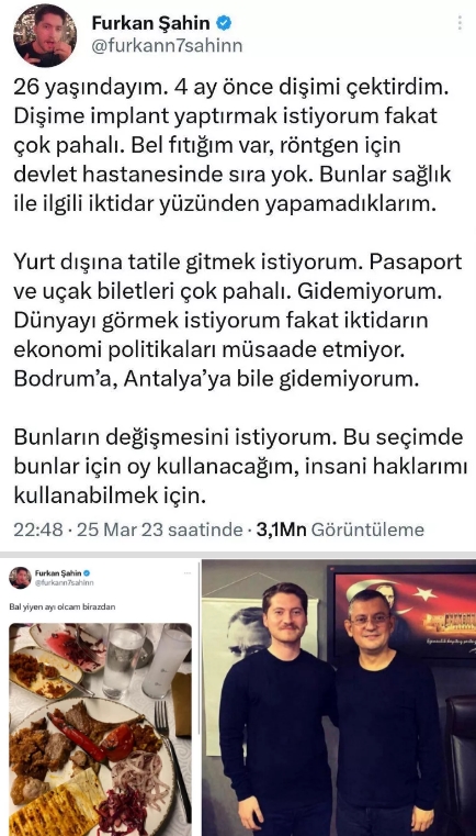 - Maddi imkansızlıklar yaşadığını iddia eden Furkan Şahin isimli bir genç, temel ihtiyaçlarını karşılayamadığını iddia etti. Sosyal medya hesaplarından maddi durumunun iyi olduğu ortaya çıkan Şahin’in CHP siyasetçilerle fotoğraf çektirdiği görüldü.