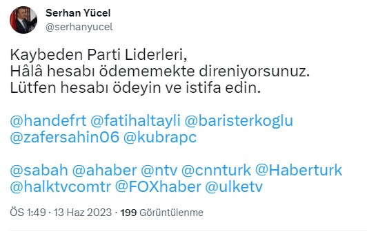 Demokrat Parti Genel Sekreterliğinden istifa eden Serhan Yücel, ittifak liderlerini de istifaya davet ederek, “Kaybeden Parti Liderleri, Hâlâ hesabı ödememekte direniyorsunuz. Lütfen hesabı ödeyin ve istifa edin” diye yazdı. Yücel’in Twitter profilinden de “Genel Sekreter” titrini sildiği dikkat çekti.