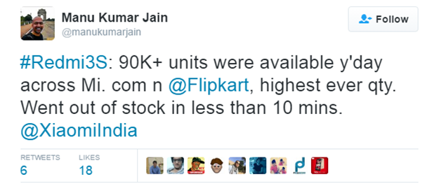 Xiaomi Redmi 3S Prime birkaç gün önce Hindistan’da mi.com ve Flipkart aracılığıyla.satışa sunulmuştu. Xiaomi Hindistan başkanı Manu Jain, şirketin sadece 8 dakika içinde 90 bin adet sattığını Twitter hesabından duyurdu.