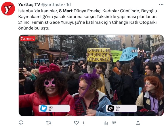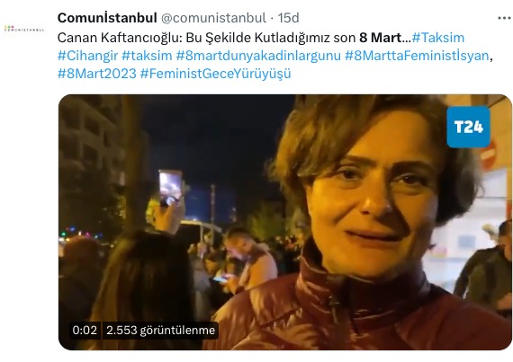 Eşcinsellerin yine yoğun destek verdiği eylemde, CHP İstanbul İl Başkanı Canan Kaftancıoğlu, 2024 yılı 8 Mart'ı için İstanbul Sözleşmesi'ni vadetti.