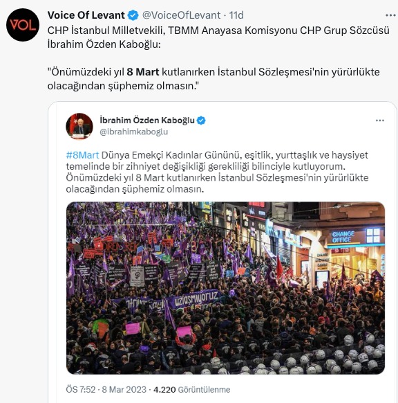 Öte yandan CHP Genel Başkanı Kemal Kılıçdaroğlu da 8 Mart sebebi ile kendisini ziyarete gelen kadın derneği temsilcilerine, "İstanbul Sözleşmesi’ni yürürlüğe koyacağız. Dolayısıyla 8 Mart, daha anlamlı bir tarih olacak" diyerek söz verdi.