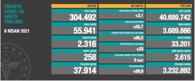 Sağlık Bakanlığı tarafından açıklanan 8 Nisan koronavirüs tablosuna göre Türkiye'de son 24 saatte toplam 55 bin 941 kişinin testi pozitif çıktı.