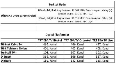 Milli Eğitim Bakanlığı'ndan yapılan açıklamaya göre, TRT - EBA TV uzaktan eğitim yayınlarının, dijital tv yayın platformlarındaki bilgileri netleşti.