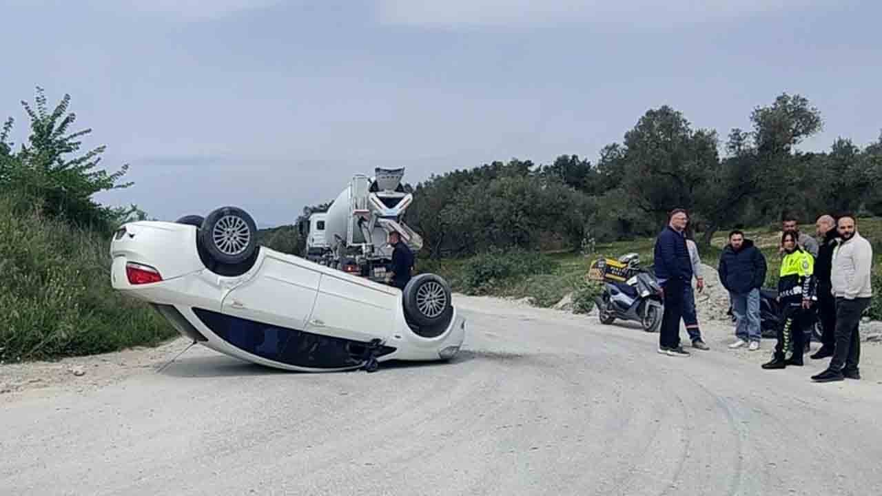 Kuşadası’nda beton mikserine çarpmamak için manevra yapan 80 yaşındaki sürücünün aracı takla attı; yaşlı adam kazayı hafif yaralı atlattı.