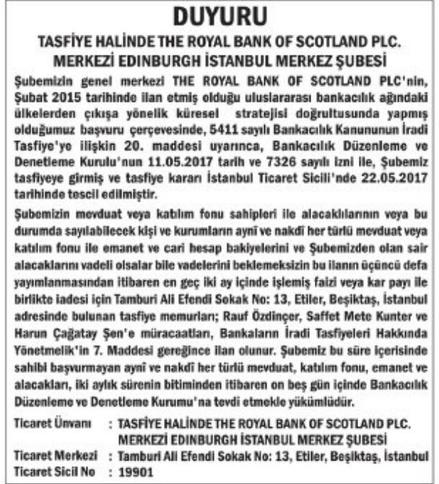 'Şubemizin genel merkezi The Royal Bank Of Scotland PLC'nin Şubat 2015 tarihinde ilan etmiş olduğu uluslararası bankacılık ağındaki ülkelerden çıkışa yönelik küresel stratejisi doğrultusunda yapmış olduğumuz başvuru çerçevesinde, 5411 sayılı Bankacılık Kanununun İradi Tasfiye'ye ilişkin 20. maddesi uyarınca, Bankacılık Düzenleme ve Denetleme Kurulu'nun 11.05.2017 tar,h ve 7326 sayılı izni ile, Şubemiz tasfiyeye girmiş ve tasfiye kararı İstanbul Ticaret Sicili'nde 22.05.2017 tarihinde tescil edilmiştir. Şubemizin mevduat veya katılım fonu sahipleri ile alacaklılarının veya bu durumda sayılabilecek durum sayılabilecek kişi ve kurumların aynî ve nakdî her türlü mevduat veya katılım fonu ile emanet ve cari hesap bakiyelerini ve Şubemizden olan sair alacaklarını vadeli olsalar bile vadelerini beklemeksizin bu ilanın üçüncü defa yayımlanmasından itibaren en geç iki ay içinde işlemiş faizi veya kar payı ile birlikte iadesi için Tamburi Ali Efendi Sokak, No: 13, Etiler, Beşiktaş, İstanbul adresinde bulunan tasfiye memurları; Rauf Özdinçer, Saffet Mete Kunter ve Harun ÇAğatay Şen'e müracaatları, Bankaların İradi Tasfiyeleri Hakkında Yönetmelik'in 7. Maddesi gereğince ilan olunur. Şubemiz bu süre içerisindeki sahibi başvurmayan aynî ve nakdî her türlü mevduat, katılım fonu, emanet ve alacakları, iki aylık sürenin bitiminden itibaren on beş gün içinde Bankacılık Düzenleme ve Denetleme Kurumu'na tevdi etmekle yükümlüdür.'